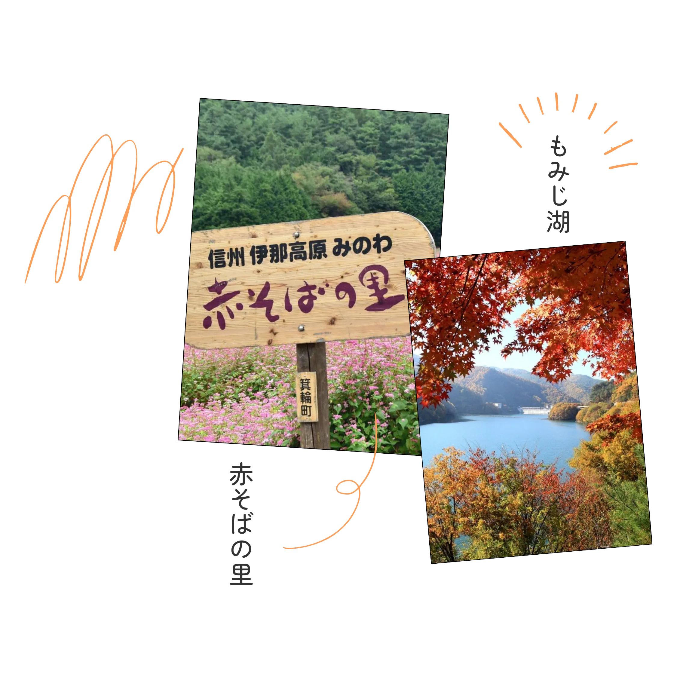 町内には赤そばの里やもみじ湖(箕輪ダム)、みのわ温泉ながたの湯など、休日にリフレッシュできる観光スポットが充実しています。